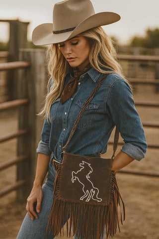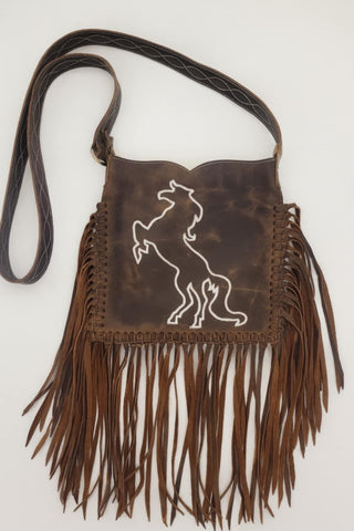 Brown Genuine leather fringe bag white stitching horse design