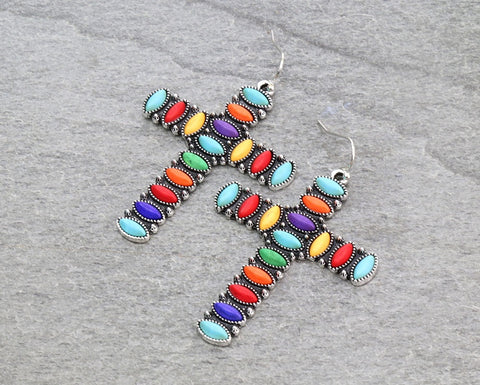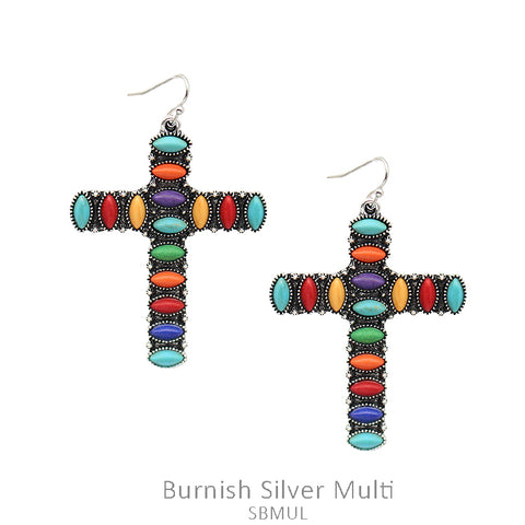 Western Stone Cross Earring - 2.25" drop - Fish hook back - Lead & nickel compliant - Measurement does not include fish hook