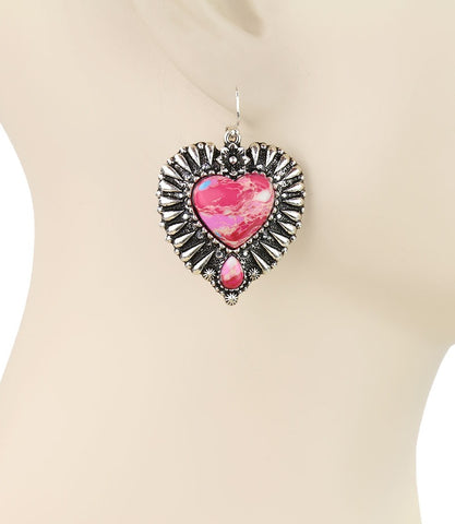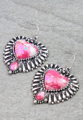 Pink speckled heart stone earrings with Western silver border trim
