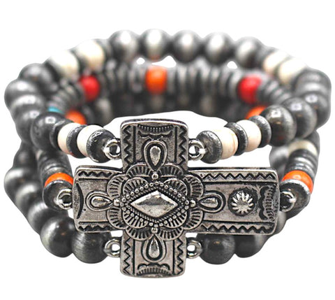 Silver navajo pearl stretch bracelet set 3 layer with orange, cream beads