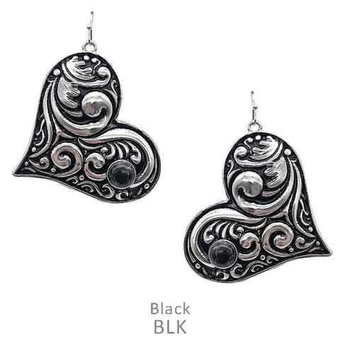 Western Stone & patterned casting heart earring - 1.625" Length - Fish hook back - Lead compliant