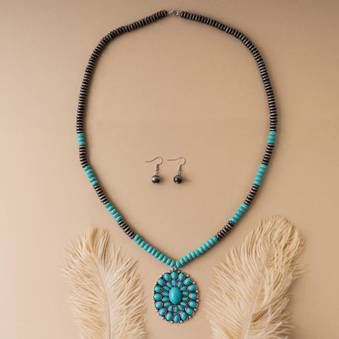 Silver & Turquoise beaded necklace with concho pendant