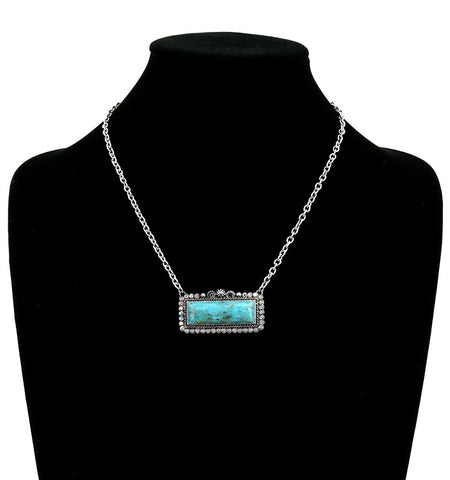 Western Rectangle Metal Rhinestone w/Stone Necklace - 18" length; 3.5" extender - 1 X 2" pendant - Lobster clasp closure - Lead compliant