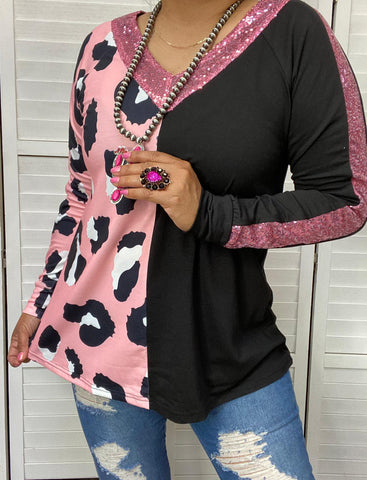 S, L, 2X, 3X Pink Leopard & Black long sleeve top with sequins