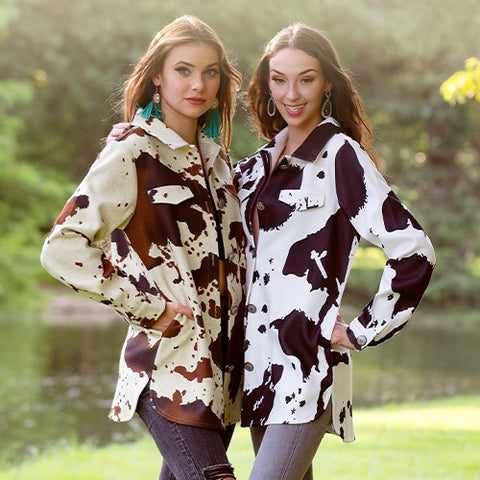 L, 2X : Brown cow print button up coat