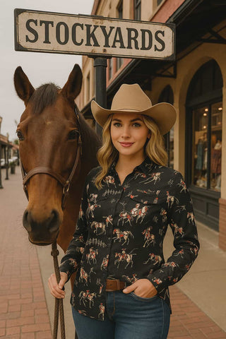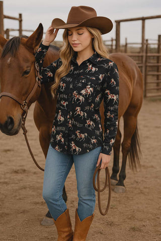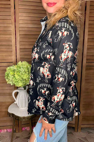 S, M, L, XL Black long sleeve top with Bronc rider print