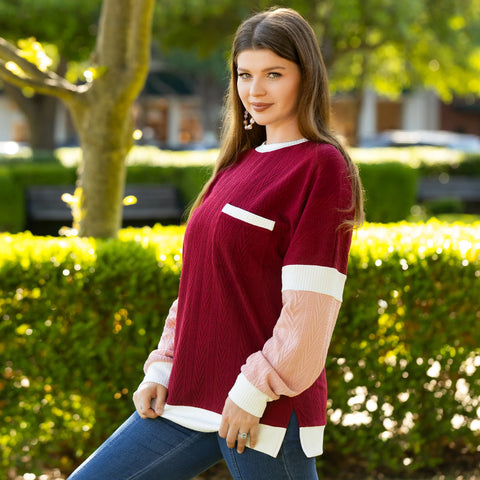 95poly 5spandex True to American Women's sizes. Color block long sleeves , pocket front, sweat shirt